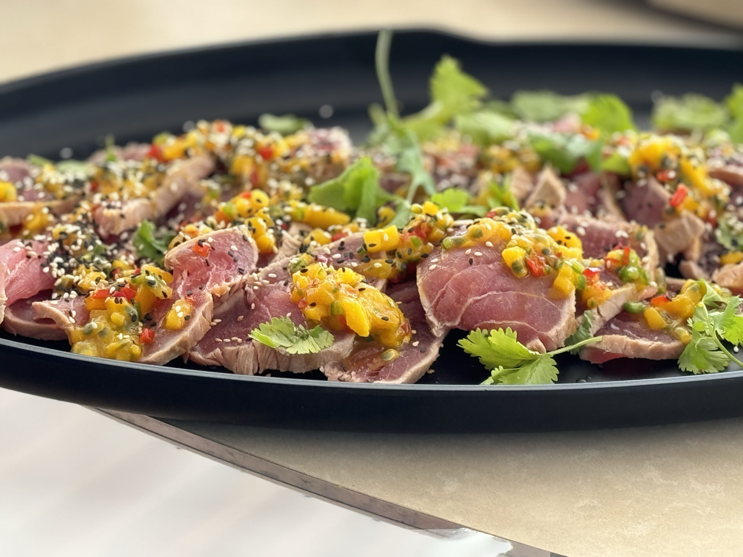The excitement peaked as Charles Leclerc claimed his spot on the podium, and we celebrated with an exquisite afternoon BBQ. Guests savoured Teriyaki beef skewers and seared tuna with toasted sesame seeds, wasabi citrus dressing, and mango and passion fruit salsa. Our lovely client from Hospitality Finder commented, “I can’t thank you all enough. Kim and David were incredible, as was the entire team. We have had nothing but positive feedback from clients…they said it was the best food yet, so well done!!”